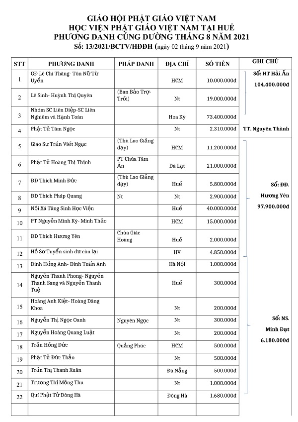 Phương danh cúng dường tháng 8 - 2021