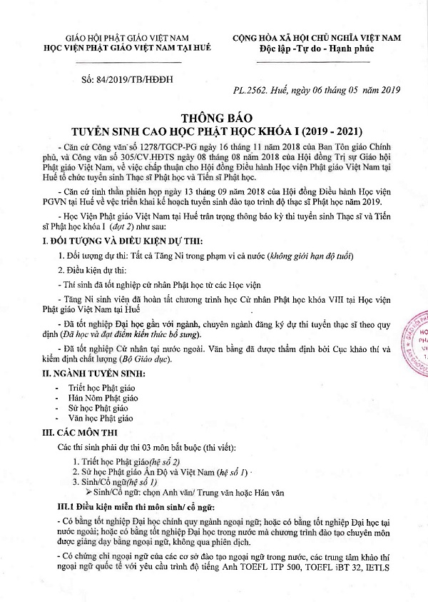 Học viện Phật giáo Việt Nam tại Huế đã ra thông báo tổ chức kỳ thi tuyển sinh Thạc sĩ và Tiến sĩ Phật học khóa I (đợt 2), thời gian tuyển sinh vào 02 ngày 23,24/8/2019 (23,24/7 Kỷ Hợi). Dưới đây là Thông báo chi tiết: