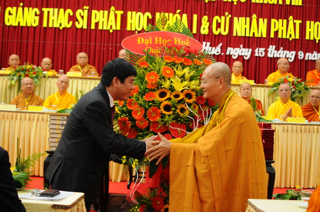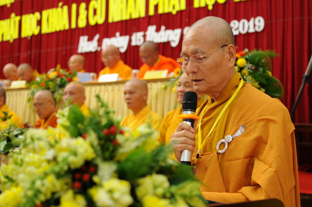 Ban đạo từ tại buổi lễ, HT. Thích Giác Toàn – Phó Chủ tịch HĐTS GHPGVN, Viện trưởng Viện Nghiên cứu Phật học Việt Nam đã nhắc lại truyền thống hiếu học của Phật giáo Thừa Thiên Huế cũng như chư Tôn thiền đức tiền bối. Hòa thượng Phó Chủ tịch HĐTS đánh giá cao tinh thần trách nhiệm, nhiệt tâm nhiệt tình của chư Tôn đức Hội đồng Điều hành Học viện, sự tận tâm giảng dạy của Ban giảng huấn, các vị giáo sư, sự nỗ lực học tập của Tăng Ni sinh cũng như sự phát tâm ủng hộ của Ban bảo trợ cũng như các ân nhân Phật tử gần xa đã tạo điều kiện thuận lợi cho Hội đồng Điều hành Học viện hoàn thành sứ mệnh giáo dục cao cả mà Trung ương Giáo hội đã giao phó.