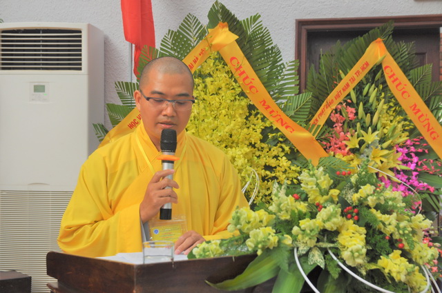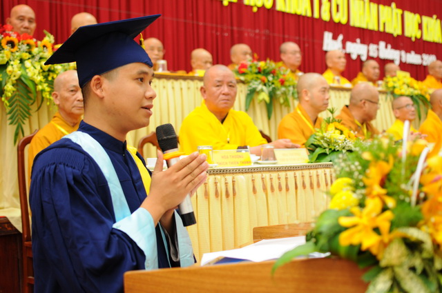 ĐĐ.TS Thích Quang Tư – Phó Viện trưởng kiêm Trưởng phòng Thông tin Truyền thông Học viện đã có lời phát biểu cảm tạ. Học viện Phật giáo Việt Nam tại Huế từ khi thành lập được sự điều hành trực tiếp của cố Trưởng lão Hòa thượng Thích Thiện Siêu, cố Trưởng lão Hòa thượng Thích Chơn Thiện và nay là Hòa thượng Thích Hải Ấn đã đào tạo được 08 khóa với hơn 1.000 Tăng Ni sinh đã Tốt nghiệp Cử nhân Phật học.