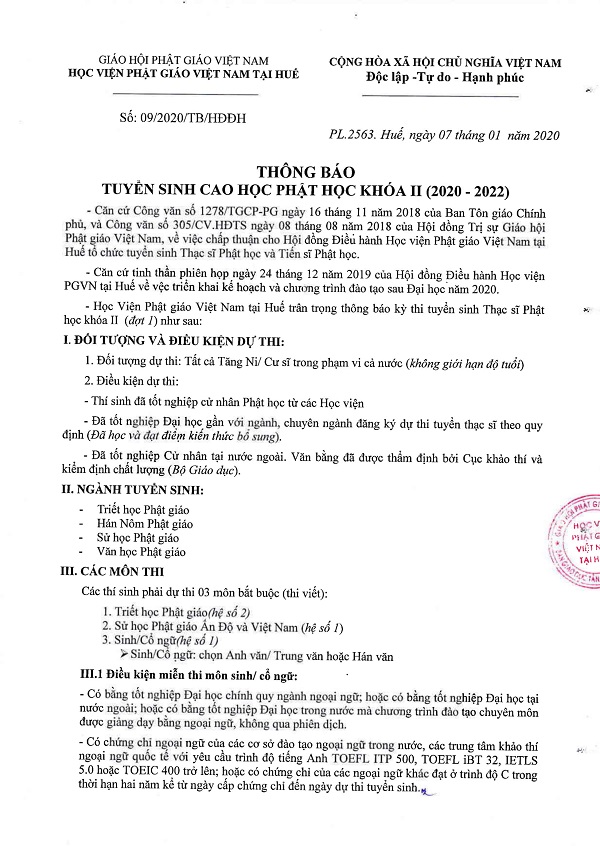 Hội đồng Điều hành Học viện Phật giáo Việt Nam tại Huế đã ra thông báo số 09/2020/TB/HĐĐH về việc tuyển sinh Thạc sĩ Phật học khóa II (đợt 1).