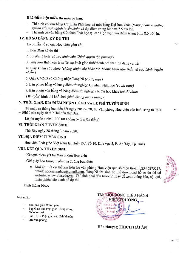 Thời gian nhận hồ sơ từ ngày ra thông báo đến hết ngày 20/03/2020 tại Văn phòng Học viện PGVN tại Huế (Tổ 10, Khu vực 5, phường An Tây, thành phố Huế)