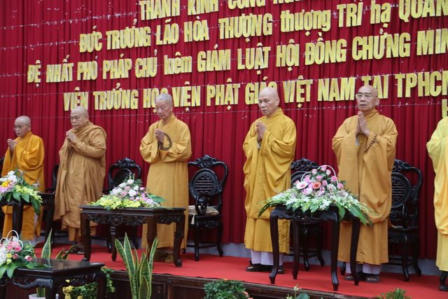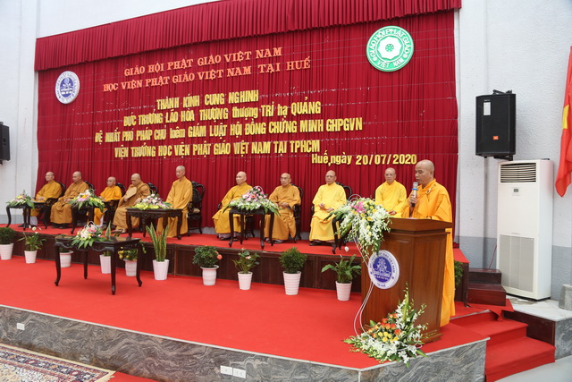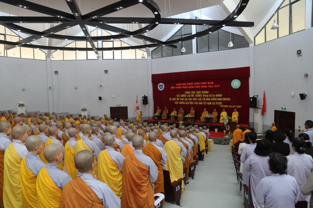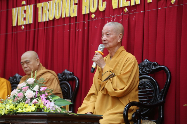 HT.Thích Hải Ấn – UVTT HĐTS GHPGVN, Viện trưởng Học viện PGVN tại Huế đã có lời phát biểu chào mừng, tri ân chuyến thăm đầy ý nghĩa của Hòa thượng Phó Pháp chủ kiêm Giám luật cùng chư Tôn đức trong phái đoàn. Hòa thượng Viện trưởng đã nêu rõ quá trình hình thành, phát triển và định hướng chung của Học viện; trong định hướng sắp đến, Học viện Phật giáo Việt Nam tại Huế sẽ tiếp tục kiện toàn về công tác tổ chức, chất lượng và quy mô đào tạo cũng như cơ sở hạ tầng, đáp ứng nhu cầu nghiên cứu – đào tạo ngày càng mở rộng và chuyên sâu.