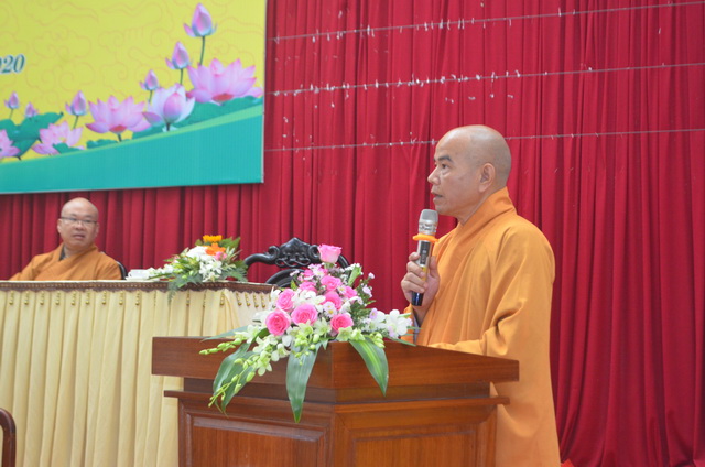 TT.TS Thích Nguyên Thành phát biểu chào mừng, báo cáo hoạt động của Học viện