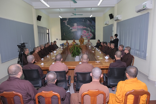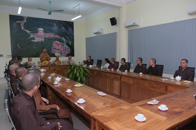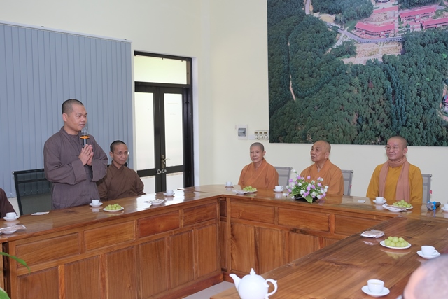 Phát biểu tại buổi gặp, HT.Thích Triệt Định đã có lời cảm ơn đến sự đón tiếp chu đáo của chư Tôn đức Hội đồng Điều hành Học viện PGVN tại Huế, gửi lời chúc sức khỏe đến Hòa thượng Viện trưởng Thích Hải Ấn, đồng thời nêu rõ mục đích của chuyến thăm và làm việc của phái đoàn tại Việt Nam lần này. Hòa thượng Trưởng phái đoàn đã chia sẻ rằng phái đoàn đã gặp gỡ và bàn thảo cùng chư Tôn đức Trung ương Giáo hội để trình dự thảo công tác tổ chức Hội thảo về hòa bình tại Việt Nam.