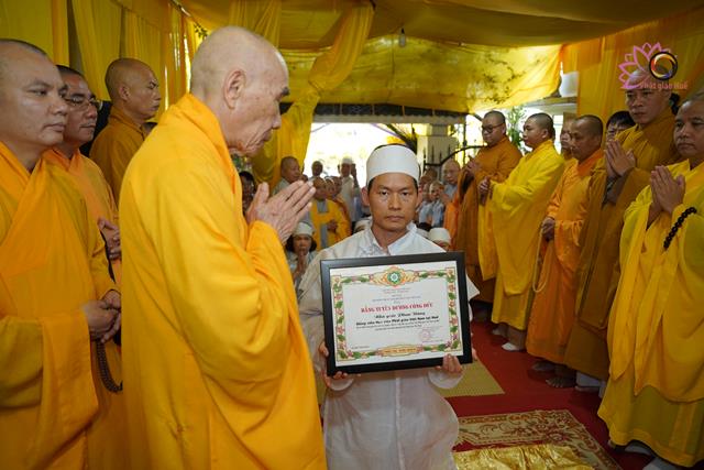 Tại buổi lễ, TT.TS Thích Nguyên Thành, UV HĐTS GHPGVN, Phó Viện trưởng Thường trực kiêm Trưởng Phòng Đào tạo Học viện đã đọc Quyết định Trao tặng bằng Tuyên dương công đức của Học viện PGVN tại Huế đến nhà giáo Phan Đăng vì đã có nhiều đóng góp tích cực cho công tác nghiên cứu, giáo dục đào tạo Tăng Ni, góp phần đào tạo nguồn nhân lực cho Giáo hội.