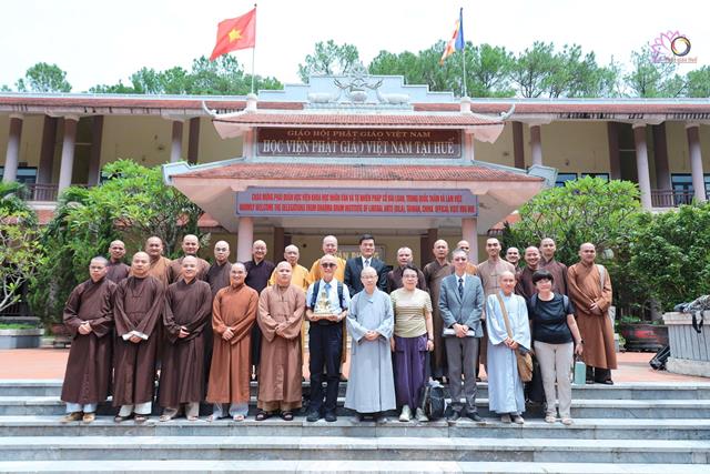 Đón tiếp thân mật phái đoàn có Trưởng lão Hòa thượng Thích Quang Nhuận, Thành viên Hội đồng Chứng minh GHPGVN, Thành viên Hội đồng Chỉ đạo Học viện; HT.Thích Hải Ấn, UVTT Hội đồng Trị sự GHPGVN, Viện trưởng Học viện PGVN tại Huế; chư Tôn đức Hội đồng Điều hành Học viện cùng các Tăng Ni sinh.