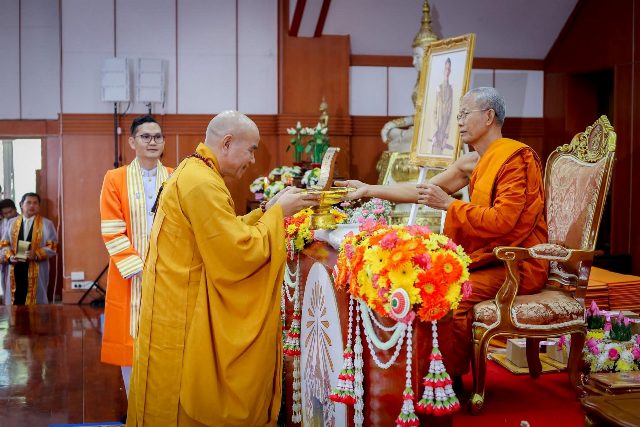 Sau nghi thức dầu nguyện, các phái đoàn dâng hoa và quà chúc mừng đến Tăng già và lãnh đạo Trường Đại học Mahamakut (Isan campus, Thái Lan).
