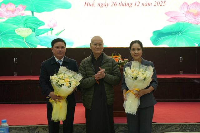 Tiếp đến, bà Trần Thị Minh Nga đã trực tiếp phổ biến các nội dung cơ bản của Luật Tín ngưỡng, Tôn giáo, đồng thời khái quát thực trạng hoạt động Phật giáo trên cả nước, với phạm vi hiện diện rộng khắp, có tính phổ quát cao và giữ vị trí quan trọng trong đời sống tinh thần của nhân dân. Bà nhấn mạnh, Giáo hội Phật giáo Việt Nam đã có nhiều đóng góp to lớn cho đất nước và xã hội, được Nhà nước ghi nhận bằng những phần thưởng cao quý, trong đó có Huân chương Hồ Chí Minh, đồng thời cho biết rằng năm 2025 được đánh giá là năm có nhiều dấu ấn của Phật giáo, với việc tổ chức thành công Đại lễ Vesak, thu hút sự quan tâm và niềm tin rất lớn của người dân, thể hiện qua số lượng hàng chục triệu lượt người tham gia các hoạt động chiêm bái xá lợi đức Phật, góp phần khẳng định vai trò tích cực của Phật giáo trong đời sống xã hội.