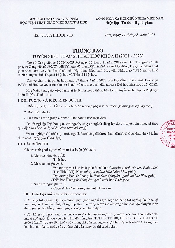 Học viện Phật giáo Việt Nam tại Huế đã ban hành Thông báo số 123/2021/HĐĐH-TB ngày 12/8/2021 về việc tổ chức tuyển sinh Thạc sĩ Phật học khóa II (2021-2023).