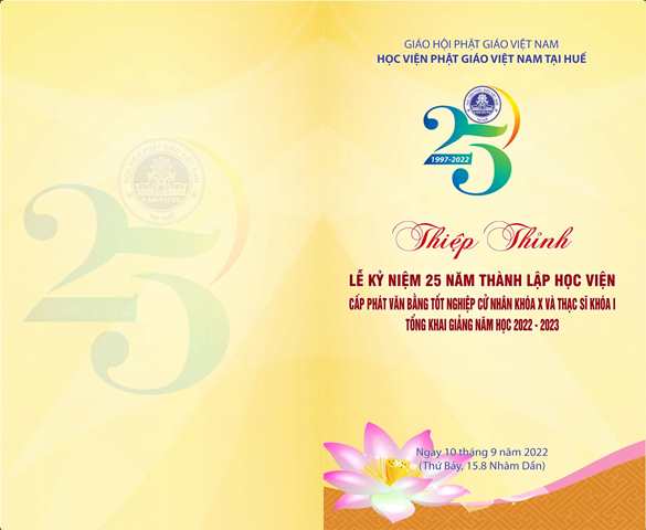 Hội đồng Điều hành Học viện PGVN tại Huế đã có thiệp thỉnh chư Tôn thiền đức Tăng Ni, thiệp mời quý quan khách, đạo hữu Phật tử các giới tham dự lễ Kỷ niệm 25 năm thành lập Học viện PGVN tại Huế, cấp phát văn bằng Tốt nghiệp Cử nhân khoá X, Thạc sĩ khoá I, tổng khai giảng năm học 2022-2023 vào ngày 09 và 10 tháng 09 năm 2022 (14 và 15.08 Nhâm Dần).