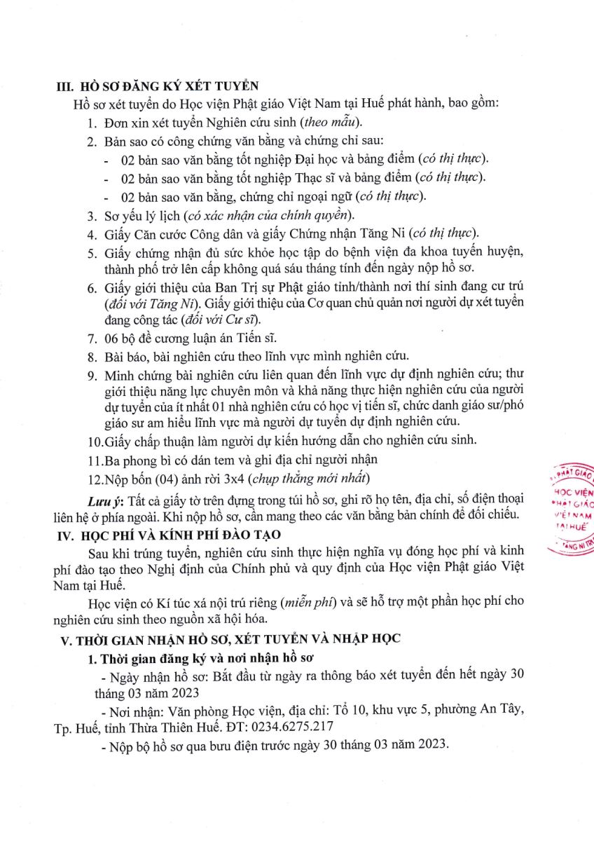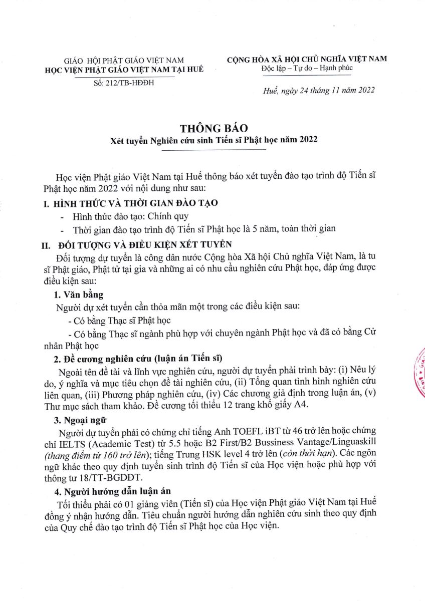 Học viện Phật giáo Việt Nam tại Huế thông báo xét tuyển đào tạo trình độ Tiến sĩ Phật học năm 2022. Thời gian đào tạo trình độ Tiến sĩ Phật học là 5 năm, toàn thời gian.