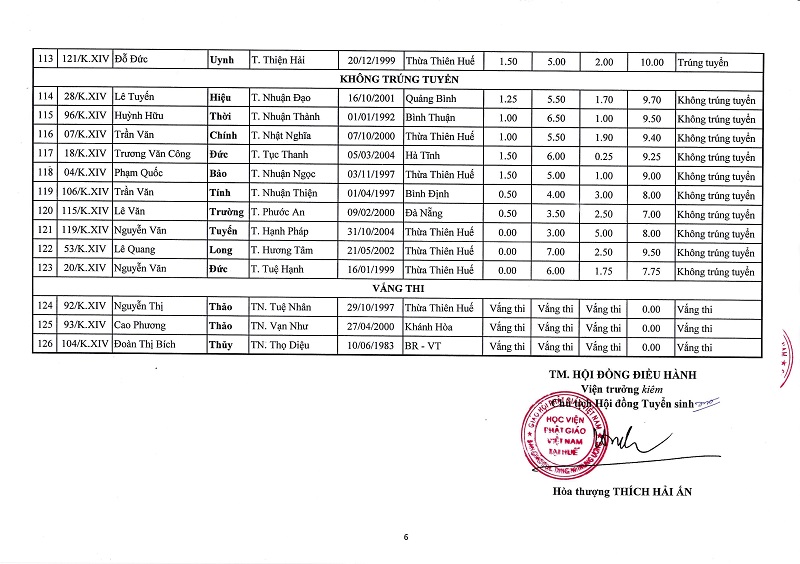Hòa thượng Thích Hải Ấn, UVTT HĐTS GHPGVN, Viện trưởng Học viện PGVN tại Huế đã ấn ký ban hành kết quả tuyển sinh Cử nhân Phật học khóa XIV (2023-2027). Qua kỳ thi được tổ chức vào ngày 20/7/2023 vừa qua, có 113 Tăng Ni thí sinh trúng tuyển, 10 Tăng Ni thí sinh không trúng tuyển và có 03 vị vắng thi.