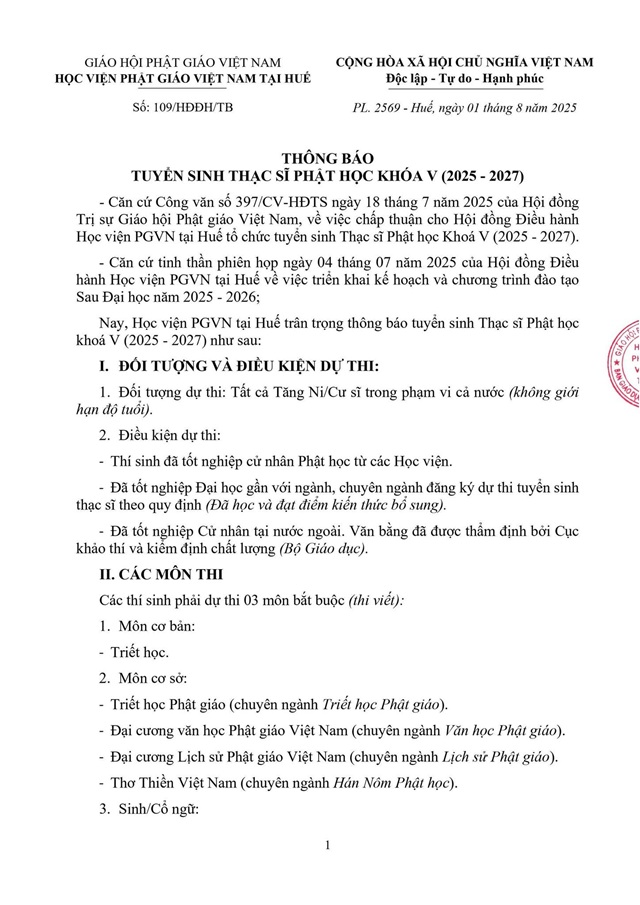 Học viện Phật giáo Việt Nam tại Huế đã có thông báo tuyển sinh Thạc sĩ Phật học khóa V (2025-2027) dành cho tất cả Tăng Ni/Cư sĩ trong phạm vi cả nước (không giới hạn độ tuổi).
