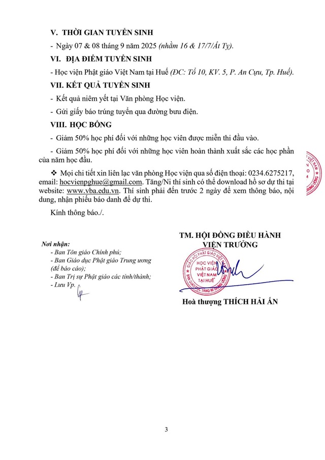 Thời gian, địa điểm nhận hồ sơ: Từ ngày ra Thông báo đến hết ngày 01/9/2025 (27.6 Ất Tỵ) tại Văn phòng Học viện PGVN tại Huế (Tổ 10, KV5, phường An Cựu, thành phố Huế) vào buổi sáng từ 7h30 – 10h30 các ngày từ thứ Hai đến thứ Bảy.