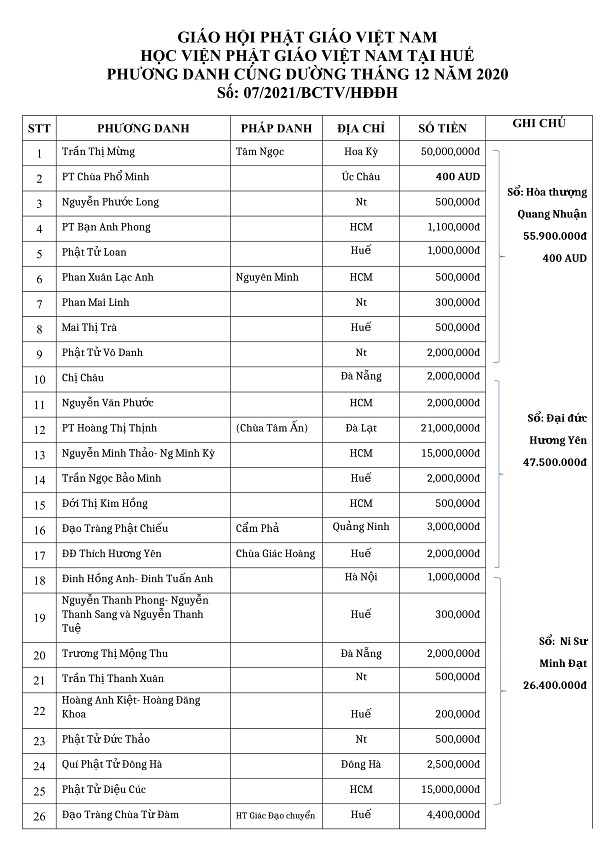 Phương danh cúng dường tháng 12 - 2020