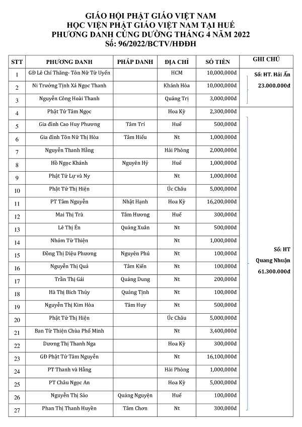 Phương danh cúng dường tháng 4 - 2022