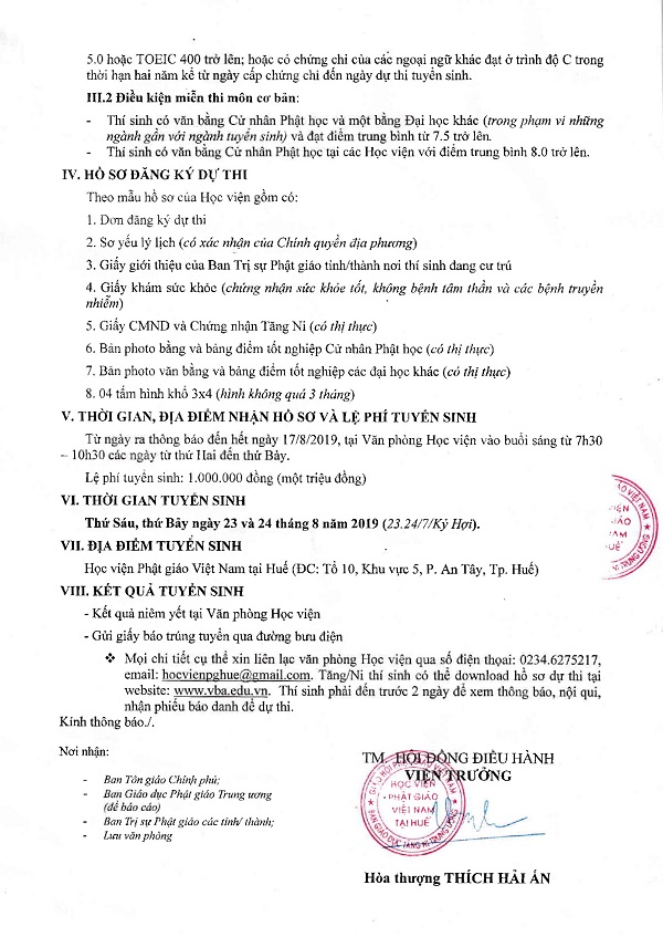Học viện Phật giáo Việt Nam tại Huế đã ra thông báo tổ chức kỳ thi tuyển sinh Thạc sĩ và Tiến sĩ Phật học khóa I (đợt 2), thời gian tuyển sinh vào 02 ngày 23,24/8/2019 (23,24/7 Kỷ Hợi). Dưới đây là Thông báo chi tiết: