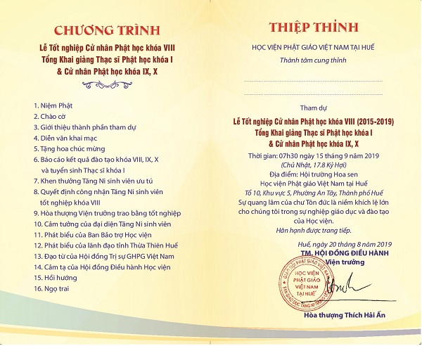 Học viện Phật giáo Việt Nam tại Huế đã có thư thỉnh/mời chư Tôn thiền đức Tăng Ni, quý quan khách và đạo hữu Phật tử tham dự lễ Tốt nghiệp Cử nhân Phật học khóa VIII (2015-2019), Khai giảng Thạc sĩ Phật học khóa I và Cử nhân Phật học khóa IX,X.