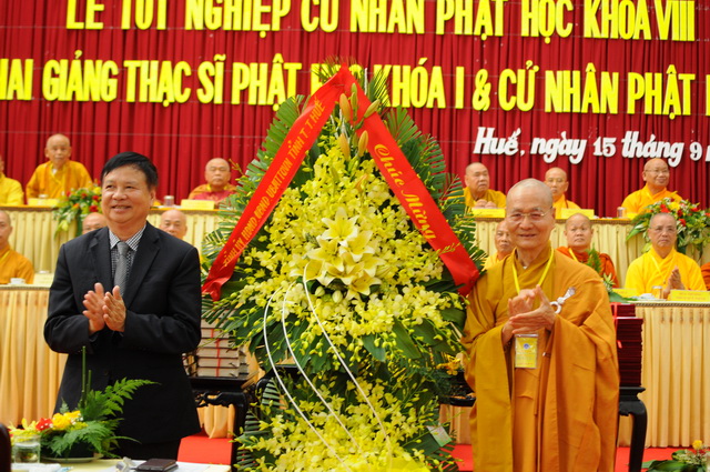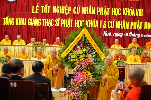 Ban đạo từ tại buổi lễ, HT. Thích Giác Toàn – Phó Chủ tịch HĐTS GHPGVN, Viện trưởng Viện Nghiên cứu Phật học Việt Nam đã nhắc lại truyền thống hiếu học của Phật giáo Thừa Thiên Huế cũng như chư Tôn thiền đức tiền bối. Hòa thượng Phó Chủ tịch HĐTS đánh giá cao tinh thần trách nhiệm, nhiệt tâm nhiệt tình của chư Tôn đức Hội đồng Điều hành Học viện, sự tận tâm giảng dạy của Ban giảng huấn, các vị giáo sư, sự nỗ lực học tập của Tăng Ni sinh cũng như sự phát tâm ủng hộ của Ban bảo trợ cũng như các ân nhân Phật tử gần xa đã tạo điều kiện thuận lợi cho Hội đồng Điều hành Học viện hoàn thành sứ mệnh giáo dục cao cả mà Trung ương Giáo hội đã giao phó.