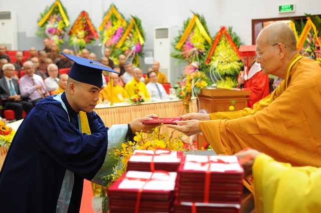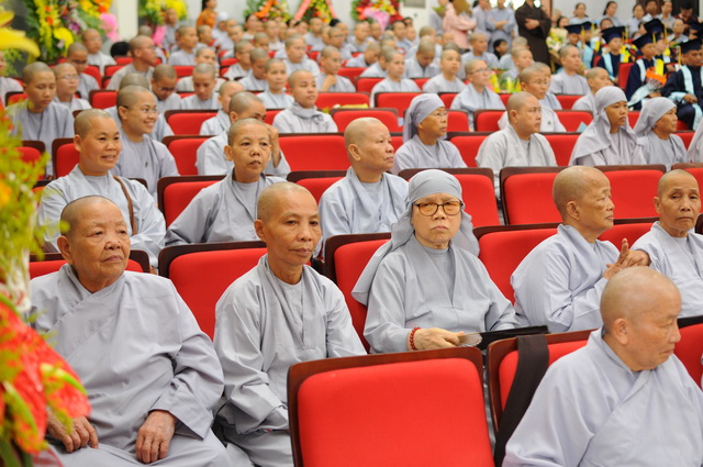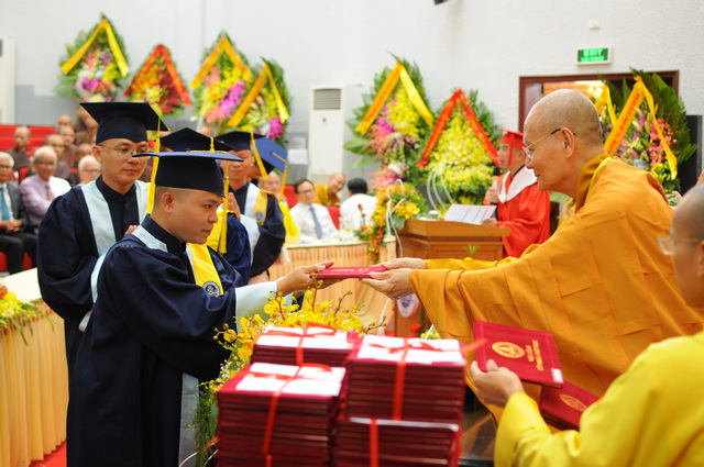 TT.TS Thích Nguyên Thành – UV HĐTS GHPGVN, Phó Trưởng Ban Giáo dục Phật giáo TƯ, Phó Viện trưởng kiêm Trưởng phòng Đào tạo Học viện PGVN tại Huế đã tuyên đọc Quyết định công nhận 142 Tăng Ni sinh viên tốt nghiệp Cử nhân Phật học khóa VIII (2015-2019); Hòa thượng Viện trưởng Thích Hải Ấn đã trao bằng Tốt nghiệp đến các Tăng Ni sinh, lần lượt các Tăng Ni sinh khóa VIII cung kính đón nhận.