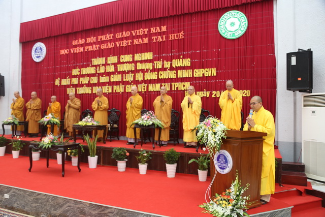 HT.Thích Hải Ấn – UVTT HĐTS GHPGVN, Viện trưởng Học viện PGVN tại Huế đã có lời phát biểu chào mừng, tri ân chuyến thăm đầy ý nghĩa của Hòa thượng Phó Pháp chủ kiêm Giám luật cùng chư Tôn đức trong phái đoàn. Hòa thượng Viện trưởng đã nêu rõ quá trình hình thành, phát triển và định hướng chung của Học viện; trong định hướng sắp đến, Học viện Phật giáo Việt Nam tại Huế sẽ tiếp tục kiện toàn về công tác tổ chức, chất lượng và quy mô đào tạo cũng như cơ sở hạ tầng, đáp ứng nhu cầu nghiên cứu – đào tạo ngày càng mở rộng và chuyên sâu.