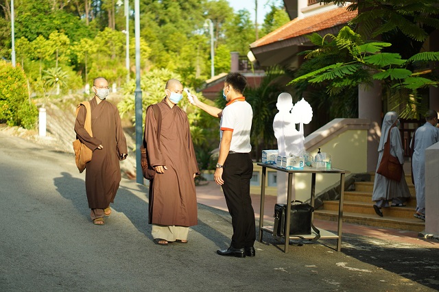 Thời điểm này, dịch Covid-19 vẫn còn ảnh hưởng rất lớn đến các tỉnh, thành phố trong cả nước. Để đảm bảo công tác phòng chống dịch một cách hiệu quả, an toàn, Hội đồng Điều hành Học viện đã phổ biến đến Tăng Ni sinh phải luôn tuân thủ nguyên tắc 5K của Bộ Y tế, trước khi vào phòng thi tất cả các thí sinh phải đo thân nhiệt, rửa tay sát khuẩn đồng thời mang khẩu trang đúng cách, an toàn.