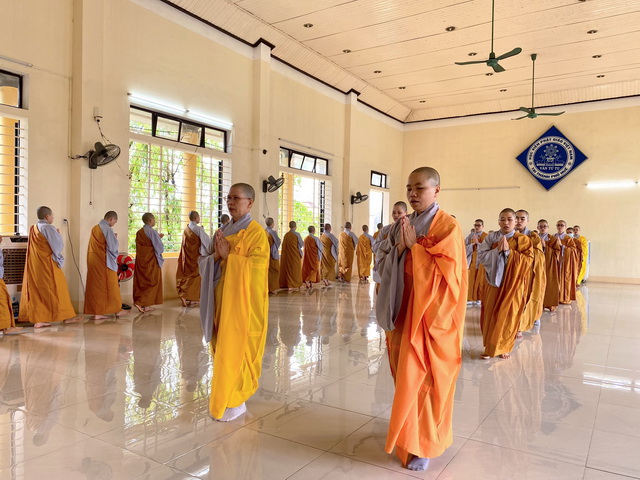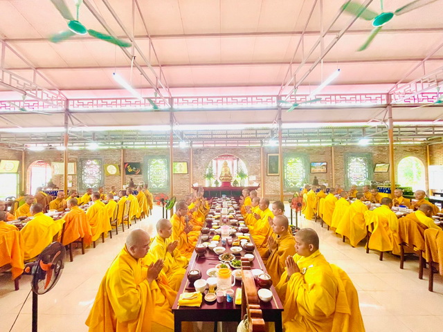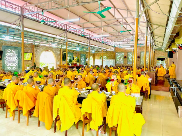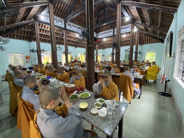 Sau khi hoàn thành khóa lễ, dưới sự hướng dẫn của chư Tôn đức Ban Quản lý Nội xá, toàn thể Ni chúng vân tập tại Trai đường thực hiện thời Quá đường đầu tiên trong mùa An cư Kiết hạ Pl.2566.