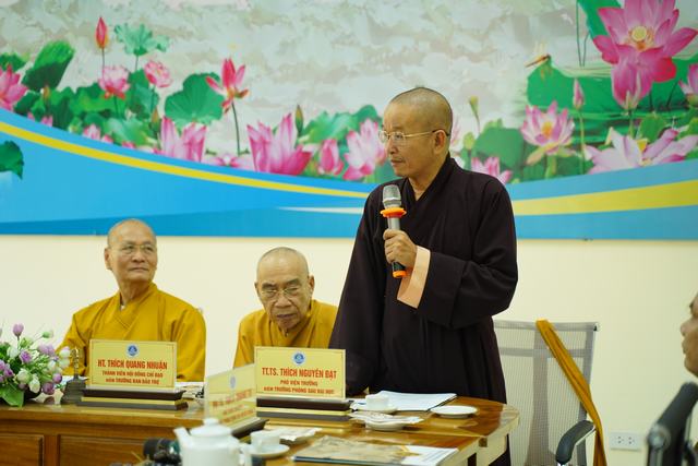 Đón tiếp thân mật phái đoàn tại Học viện có HT.Thích Quang Nhuận, Thành viên Hội đồng Chỉ đạo Học viện; HT.Thích Hải Ấn, Viện trưởng Học viện; TT.TS Thích Nguyên Đạt, Phó Viện trưởng kiêm Trưởng Phòng Sau đại học; ĐĐ.TS Thích Quang Tư, Phó Viện trưởng kiêm Trưởng Phòng TTTT; TT.TS Thích Không Nhiên, Phó Viện trưởng kiêm Trưởng Phòng Nghiên cứu; ĐĐ.TS Thích Hương Yên, Phó Viện trưởng kiêm Trưởng Phòng Hành chính cùng chư Tôn đức Hội đồng Điều hành Học viện và giảng viên.