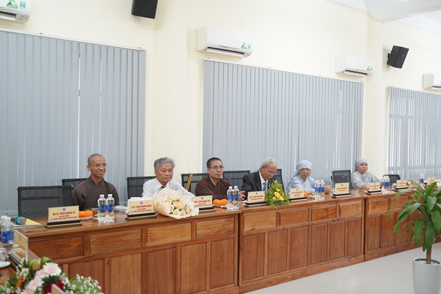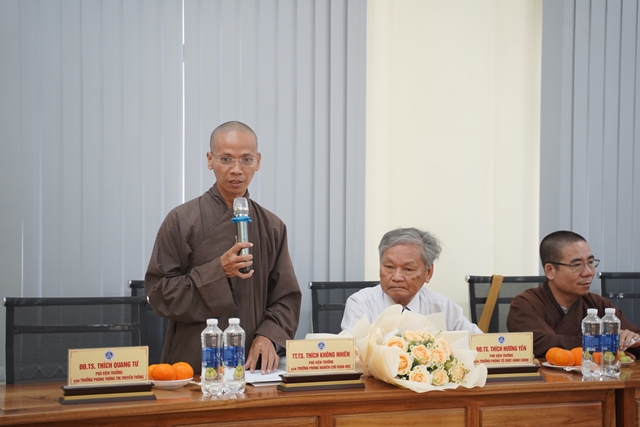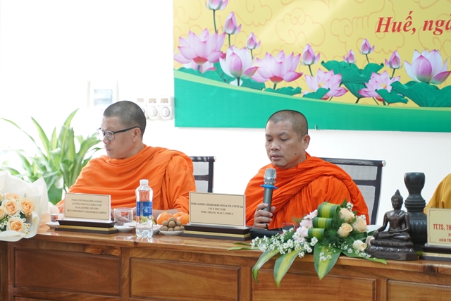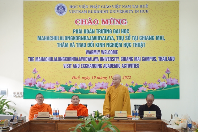 TT.TS Thích Nguyên Thành đã có lời phát biểu chào mừng, giới thiệu sơ lượt về sự hình thành và phát triển, cũng như công tác đào tạo của Học viện Phật giáo Việt Nam tại Huế, đồng thời bày tỏ niềm hân hoan khi được đón tiếp phái đoàn thăm và trao đổi kinh nghiệm về giáo dục Phật giáo.