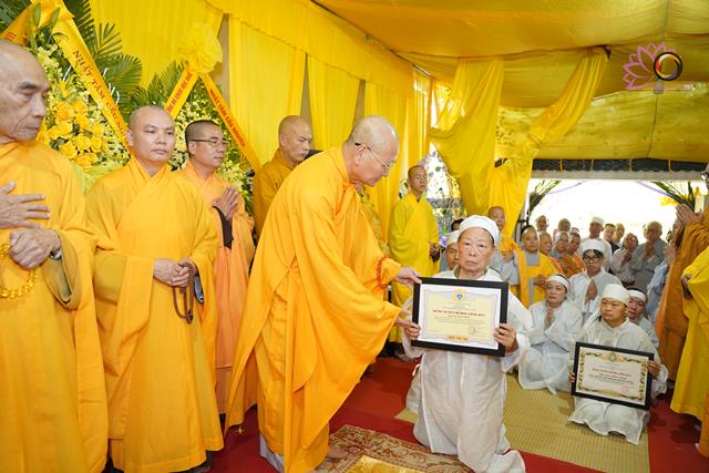 Trưởng lão Hòa thượng Thích Quang Nhuận trao bằng Tuyên dương công đức của Trung ương Giáo hội đến gia đình