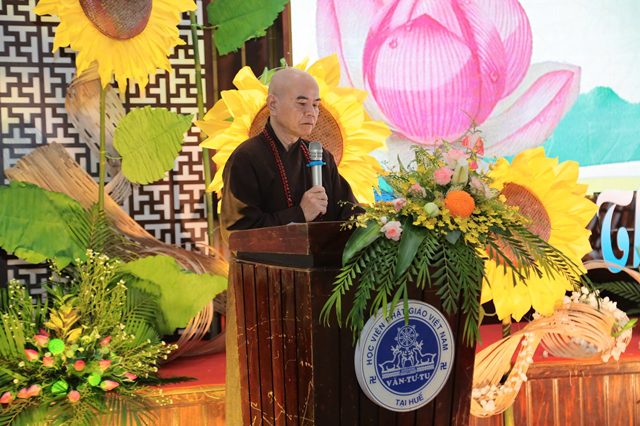 Tiếp đó, TT.Thích Minh Thuận đã thay mặt phái đoàn phát biểu, Thượng tọa bày tỏ niềm hoan hỷ khi lần đầu tiên được đến thăm Học viện Phật giáo Việt Nam tại Huế – một môi trường đào tạo rất trong lành, thanh tịnh, cách xa đô thị, tạo điều kiện thuận lợi cho hành giả an trú tu học và phát triển trí tuệ. Thượng tọa tán dương mô hình đào tạo của Học viện, đồng thời khuyến khích Tăng Ni sinh nỗ lực trau dồi tri thức, hướng đến việc học lên bậc Tiến sĩ để góp phần nâng cao trình độ học thuật Phật giáo Việt Nam. Bên cạnh đó, Thượng tọa nhấn mạnh tầm quan trọng của ngoại ngữ trong thời đại hội nhập, xem đây là hành trang thiết yếu để Tăng Ni sinh có thể giao lưu, học hỏi và truyền bá Phật pháp đến bạn bè quốc tế.