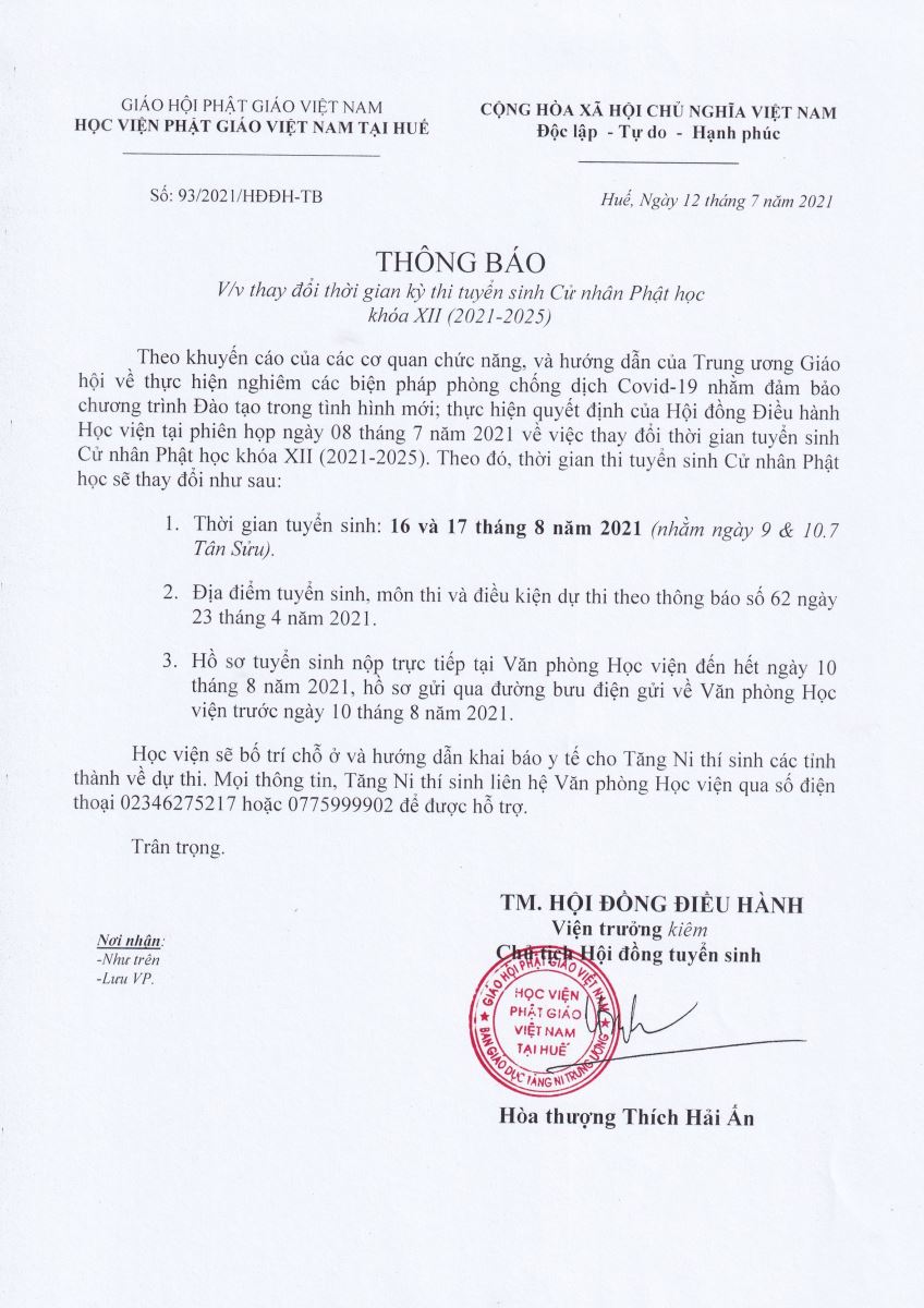 Thông báo về việc thay đổi thời gian kỳ thi tuyển sinh Cử nhân Phật học Khóa XII (2021-2025)