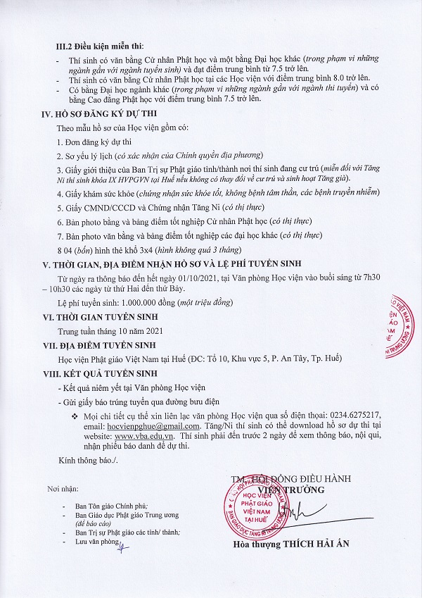 Học viện Phật giáo Việt Nam tại Huế đã ban hành Thông báo số 123/2021/HĐĐH-TB ngày 12/8/2021 về việc tổ chức tuyển sinh Thạc sĩ Phật học khóa II (2021-2023).