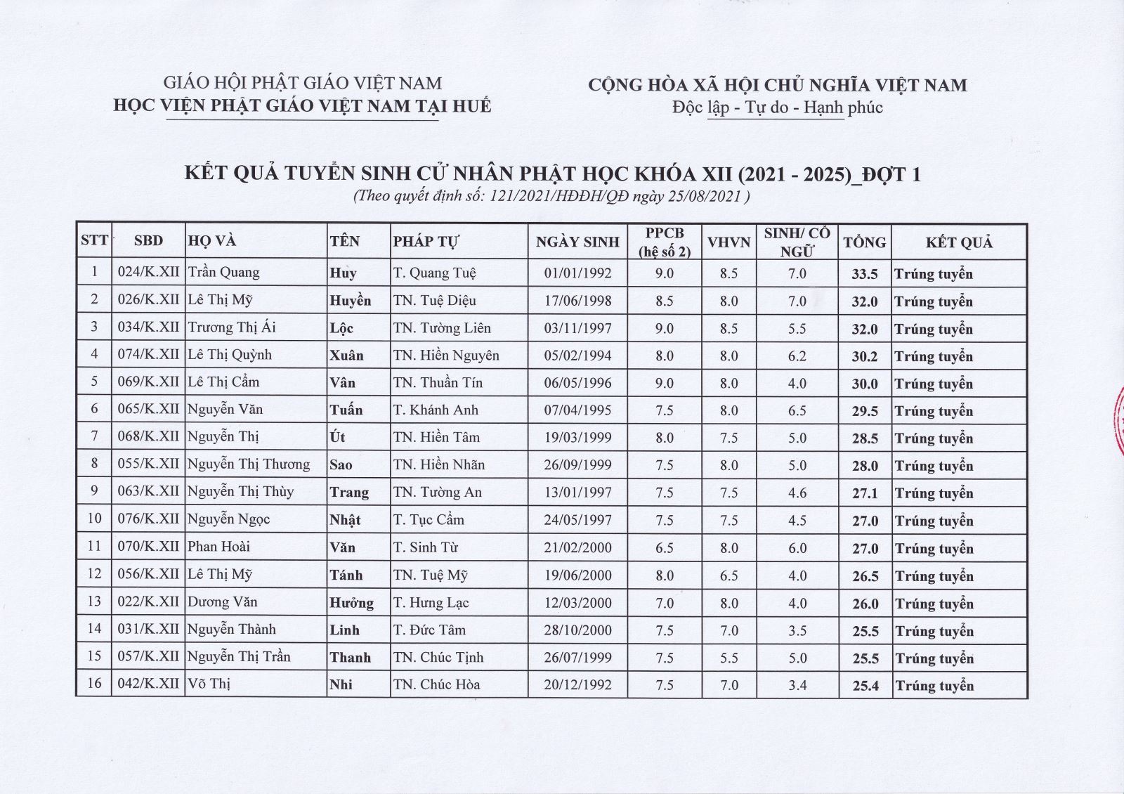 Kết quả tuyển sinh Cử nhân Phật học khóa XII (2021-2025) – đợt 1