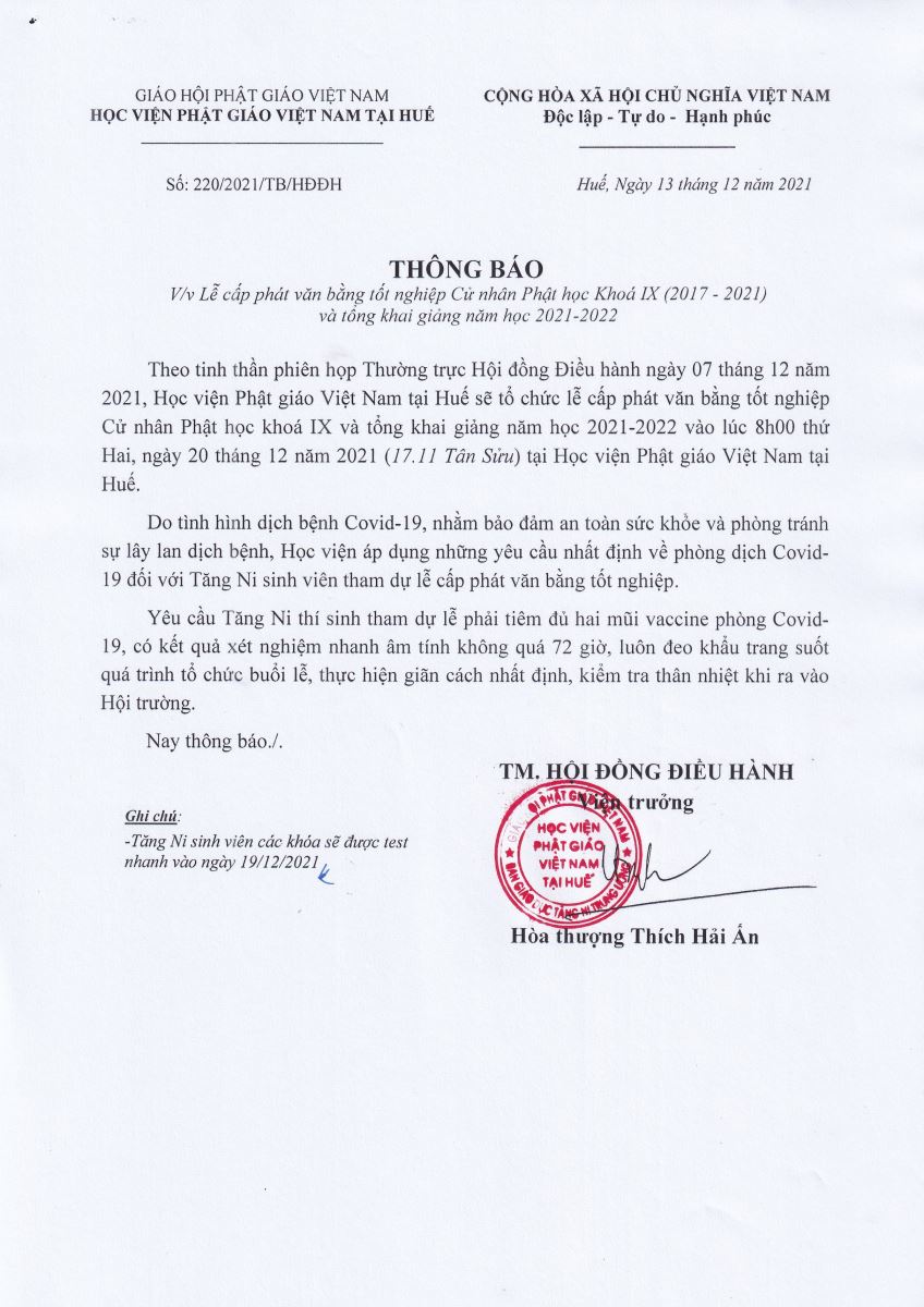 Dời ngày tổ chức Lễ cấp phát văn bằng tốt nghiệp Cử nhân Phật học khoá IX và dạy trực tuyến các cấp Cử nhân và Thạc sĩ
