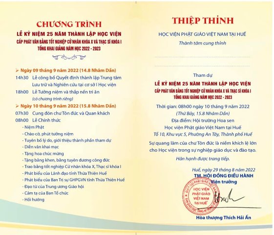 Hội đồng Điều hành Học viện PGVN tại Huế đã có thiệp thỉnh chư Tôn thiền đức Tăng Ni, thiệp mời quý quan khách, đạo hữu Phật tử các giới tham dự lễ Kỷ niệm 25 năm thành lập Học viện PGVN tại Huế, cấp phát văn bằng Tốt nghiệp Cử nhân khoá X, Thạc sĩ khoá I, tổng khai giảng năm học 2022-2023 vào ngày 09 và 10 tháng 09 năm 2022 (14 và 15.08 Nhâm Dần).