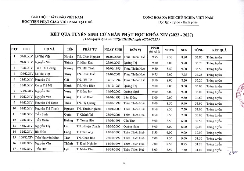 Dưới đây là Kết quả tuyển sinh Cử nhân Phật học khóa XIV (2023-2027):