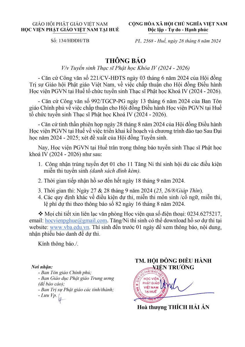 Ngày 28 tháng 8 năm 2024 Hội đồng Điều hành thông báo tuyển sinh Thạc sĩ Phật học Khoá IV (2024 - 2026) như sau: