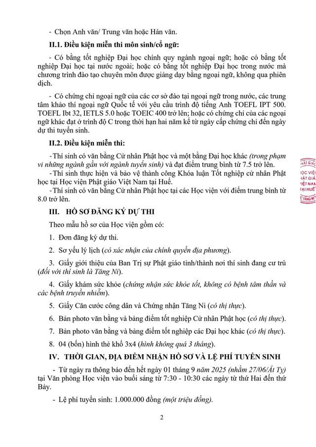 Học viện Phật giáo Việt Nam tại Huế đã có thông báo tuyển sinh Thạc sĩ Phật học khóa V (2025-2027) dành cho tất cả Tăng Ni/Cư sĩ trong phạm vi cả nước (không giới hạn độ tuổi).